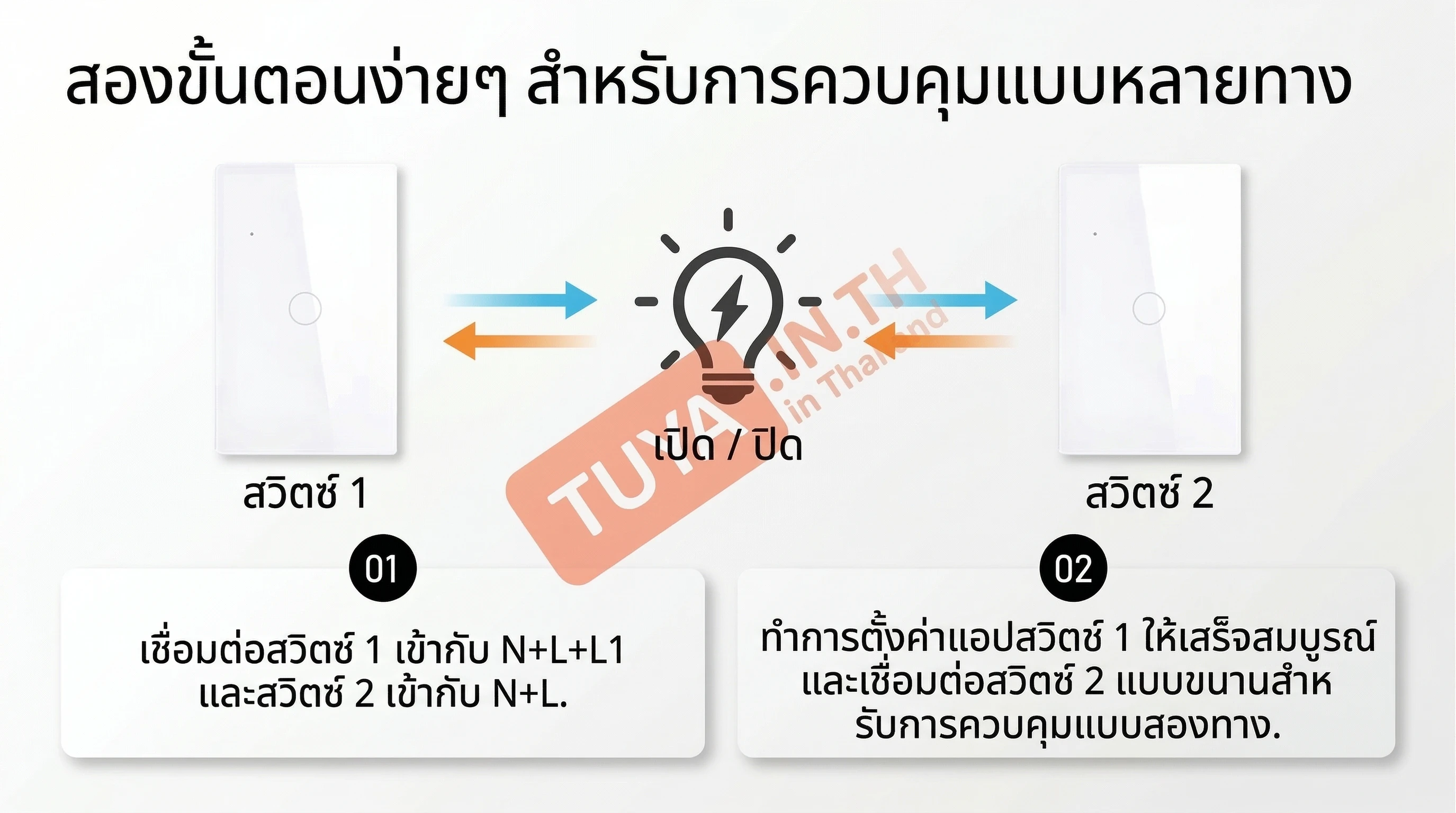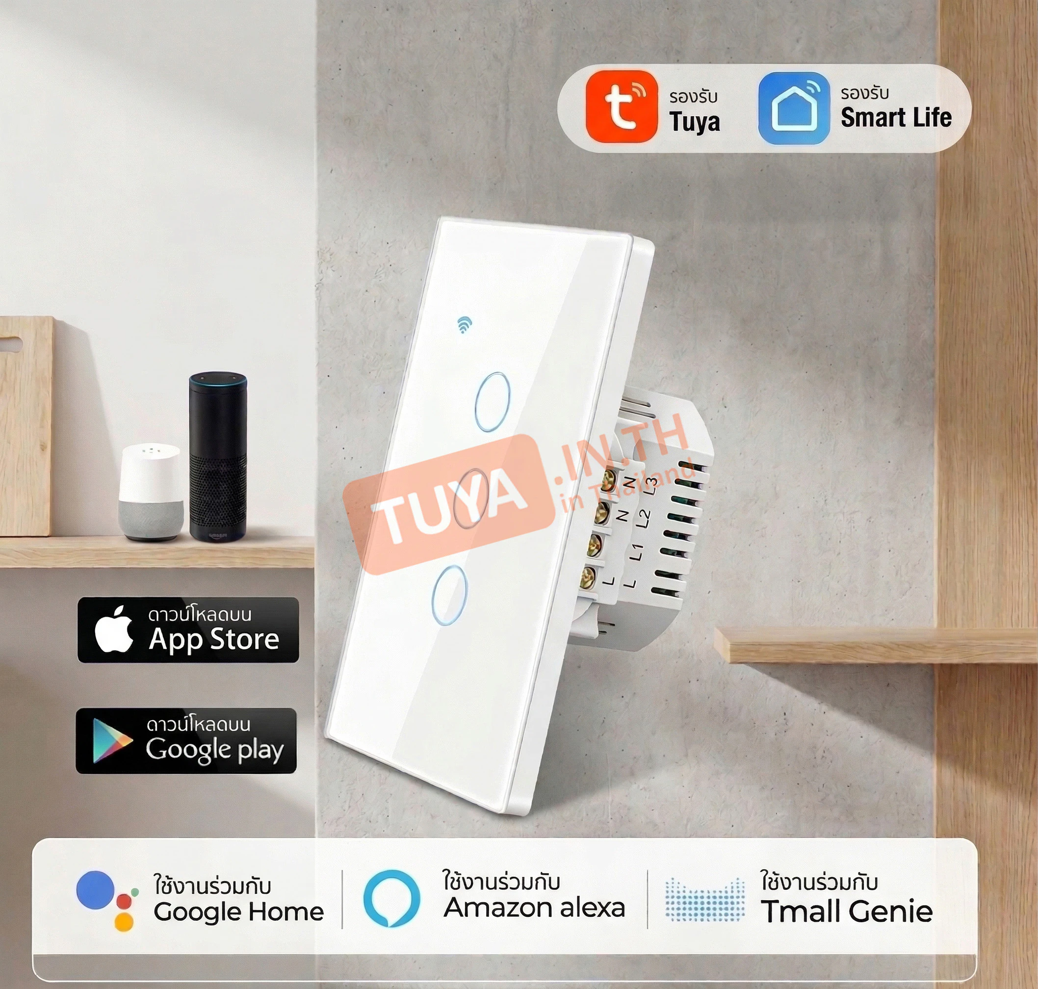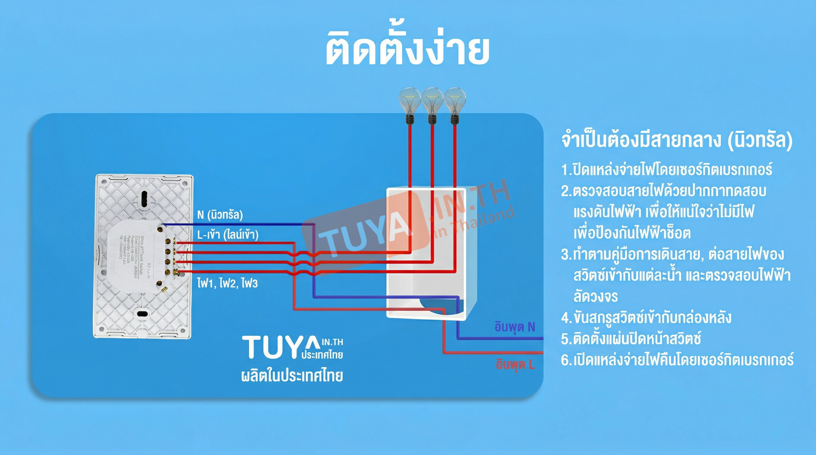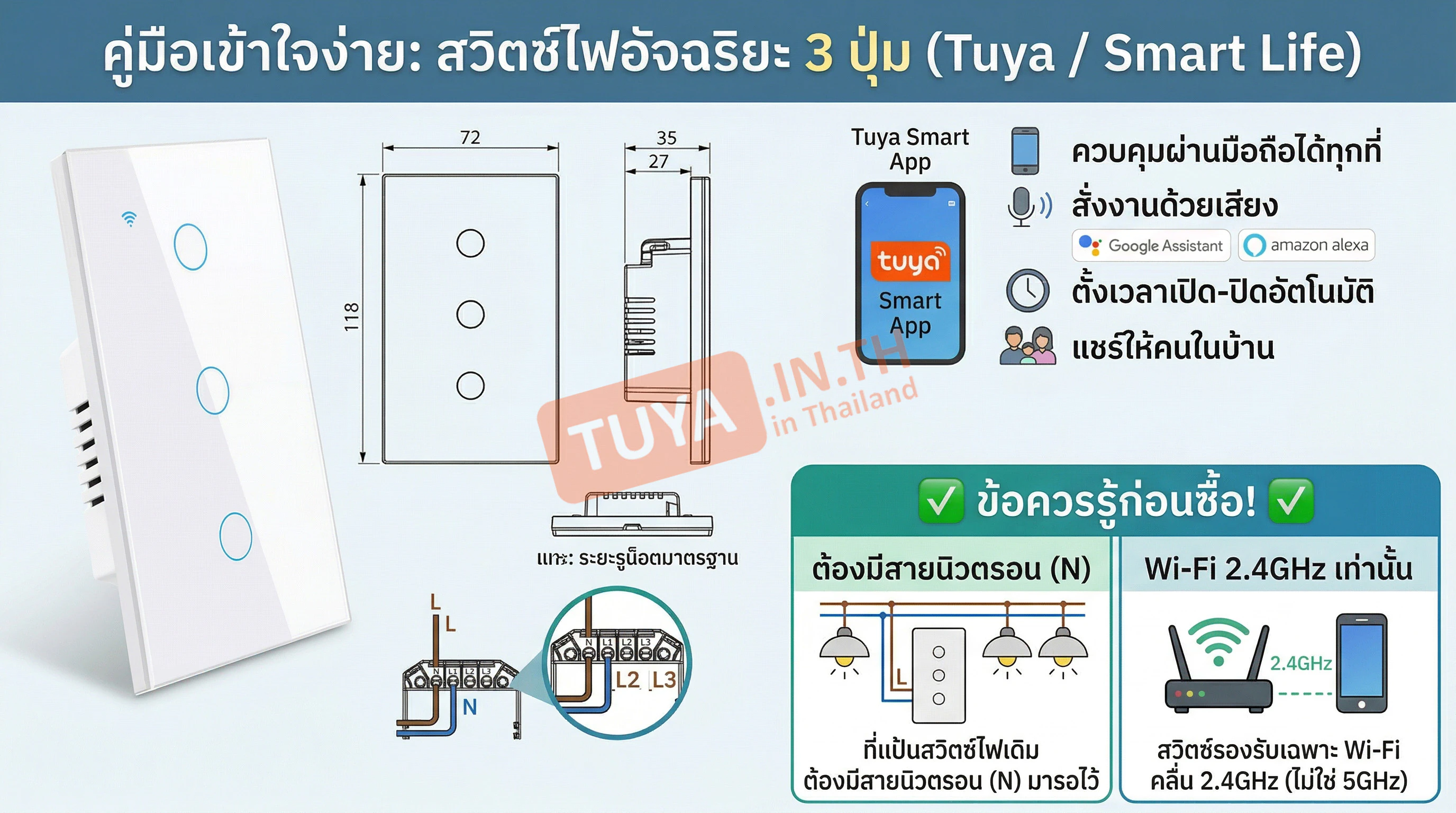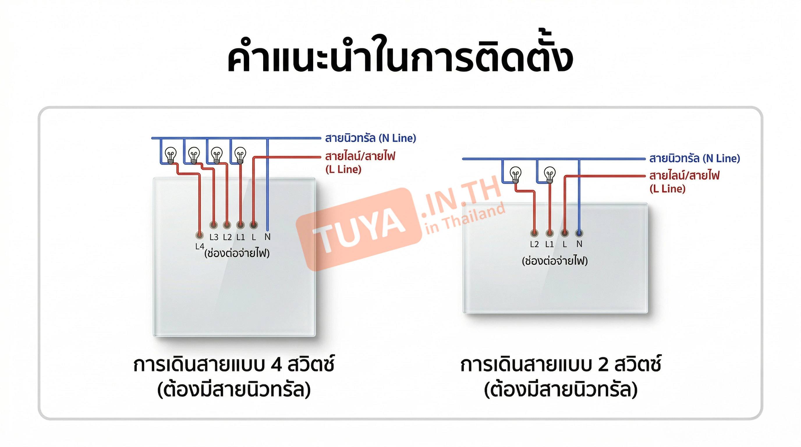 - • การติดตั้ง: มีรุ่นที่รองรับทั้ง แบบใช้สาย Neutral (L/N) และ แบบไม่ใช้สาย Neutral (ใช้ Capacitor แทน)