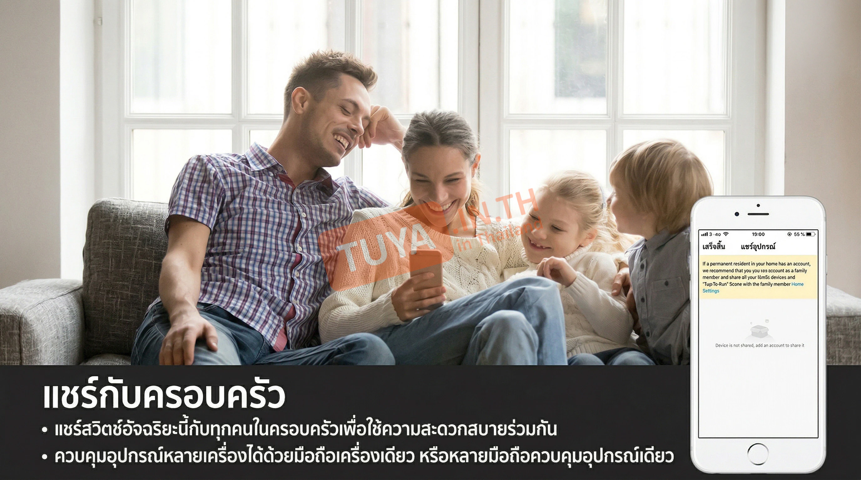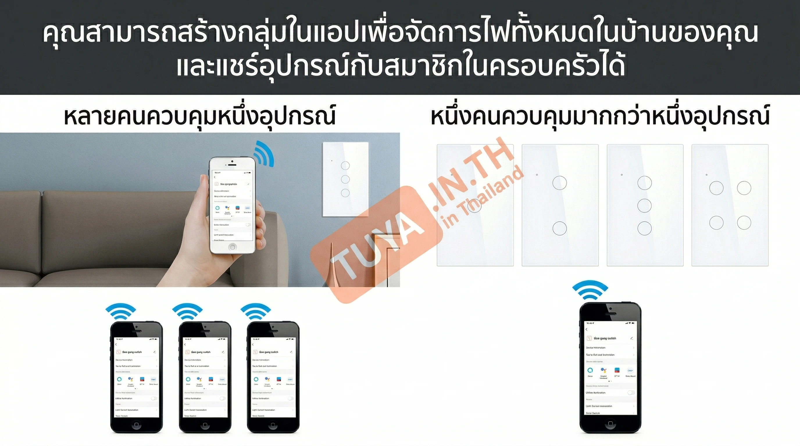 - ✓ ระบบแชร์และกลุ่ม: แบ่งปันการควบคุมให้คนในบ้านได้ และสั่งงานสวิตช์หลายตัวพร้อมกันเป็นกลุ่มได้