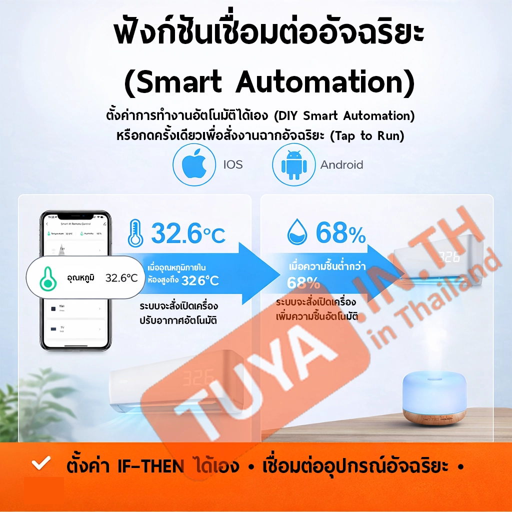 • การเชื่อมต่อแบบอัจฉริยะ โดยการสั่งงานด้วยแอปพลิเคชั่น เช่น เมื่ออุณหภูมิสูงขึ้น 30 องศาเซลบเซียส ให้เปิดเครื่องปรับอากาศ